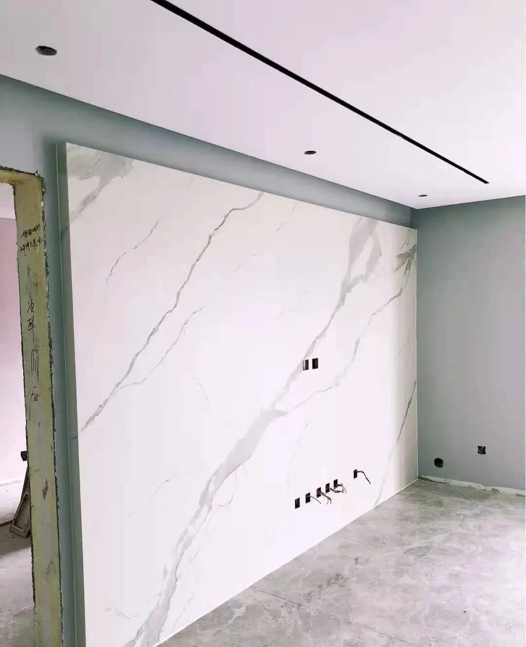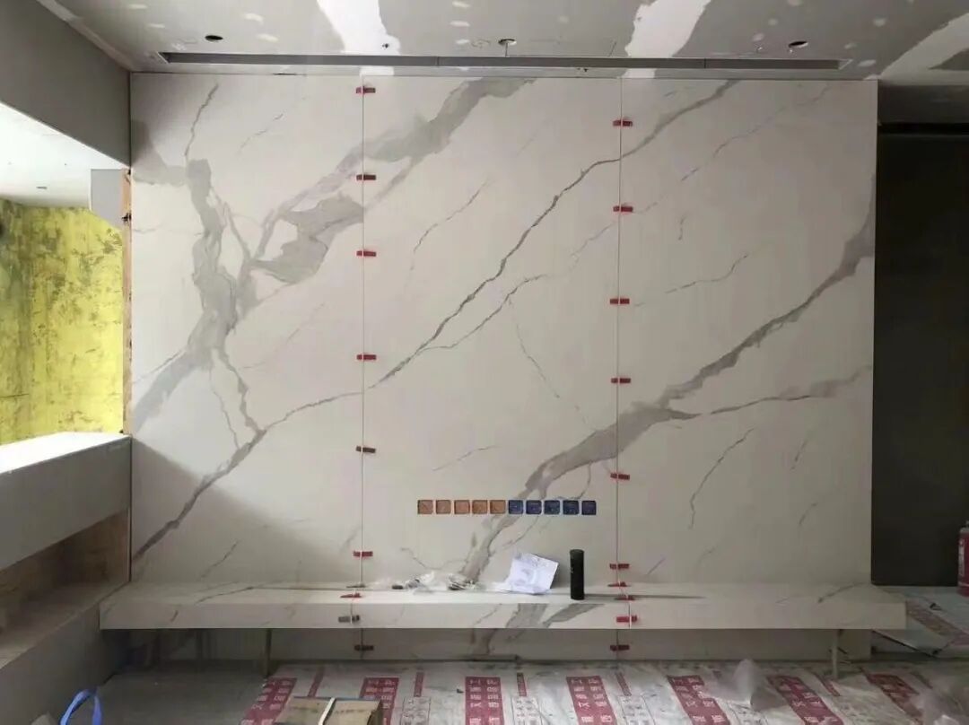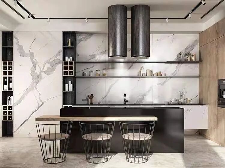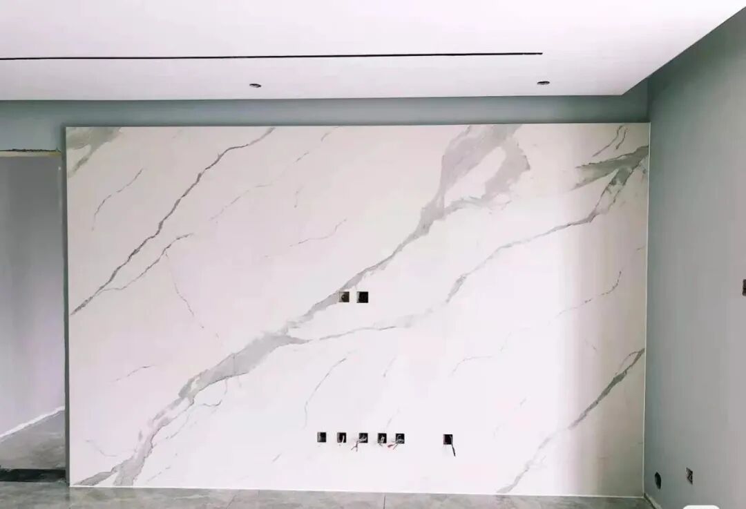 而且这款1200*2600的意大利雪花白六连纹的板更是这两年的经典款。除了尺寸非常适合用于背景墙,板的纹理和质感也是非常的不错。